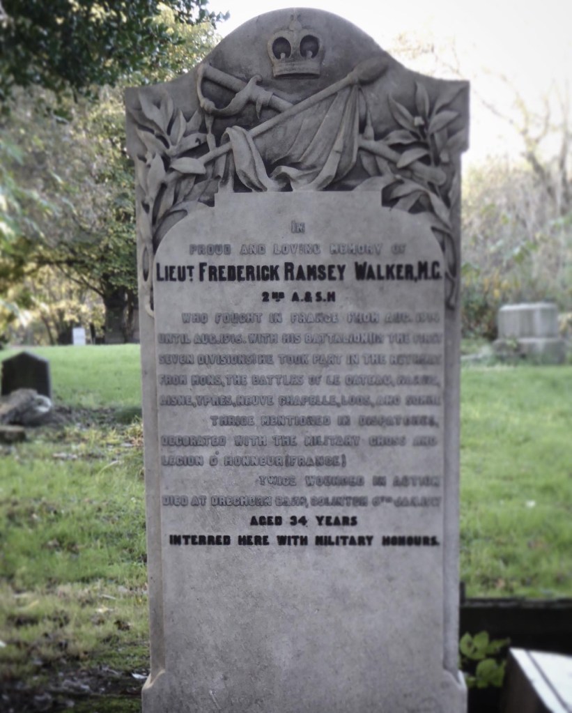 Here’s a happy outcome that I only discovered last night: the grave of Lieutenant Frederick Ramsey Walker, of the Argyll and Sutherland Highlanders, was restored in 2017 by a mystery benefactor!