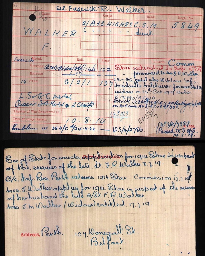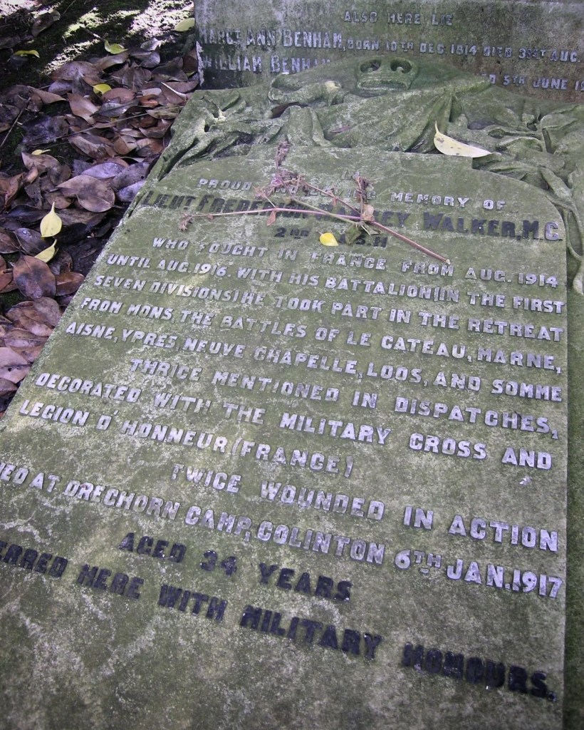 Lieutenant Frederick Ramsey Walker was twice wounded in action, and he died suddenly at Dreghorn Camp, Colinton, Edinburgh, on the 7th January 1917, aged 34. 600 men from different battalions attended his graveside funeral, following the funeral cortège which was accompanied by pipe and brass bands. Shots were fired to mark his passing.